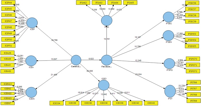 A Tabela 3 demonstra os indicadores de confiabilidade obtidos da sua carga fatorial e a Figura 1, na próxima página, o correspondente Modelo Ajusta- do com as Cargas Fatoriais, cujos valores no intervalo entre 0,4 e 0,7 são respeitados. Com relação aos valores do teste t dos indicadores reflexivos do ICEA (11,569), ICEIN (20,821), ICEO (70,105), ICEP (34,484), IFSPG (13,394), IFST (36,351), IF-SEN (10,993), IFSA (8,812), IFSEC (18,676) e Características Empreendedoras (4,816) presentes no modelo (Figura 16), mostraram que todos eram superiores a 1,96, indicando uma probabilidade de significância menor que 0,05 (p-valor £ 0,05).