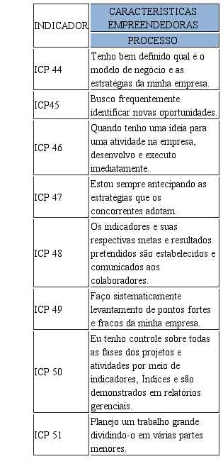 d) Indicadores reflexivos das Característi- cas Empreendedoras do Processo - ICEP 44, ICEP 45, ICEP 46, ICEP 47, ICEP 48, ICEP 49, ICEP 50 e ICEP 51;