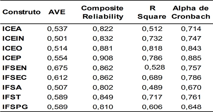 A Tabela 1 evidencia os resultados da AVE para os constructos ICEA, ICEIN, ICEO e ICEP, confirmando a validade convergente do modelo (AVE acima de 0,50), e os testes para análise da consistência interna (Alpha de Cronbach acima 0,60 e 0,70 são adequados) e confiabilidade composta (acima de 0,80 e 0,90 são satisfatórios), conforme explicaram Hair Jr. et al. (2014) do modelo reflexivo de mensuração.
