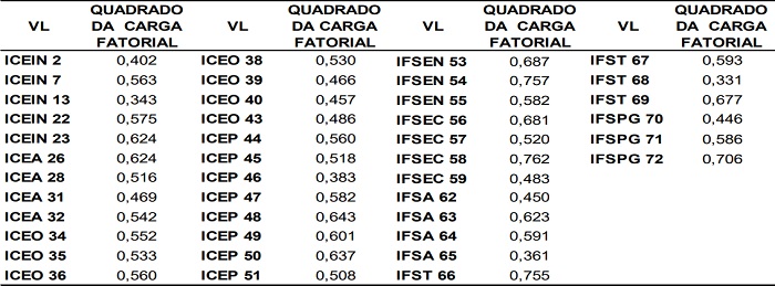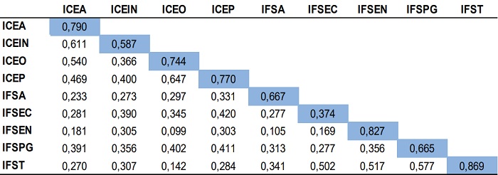 Para os constructos com AVE abaixo de 0,50, excluiu-se as variáveis com cargas fatoriais com valores menores. Com a exclusão desses indicadores, o modelo de mensuração assumiu novos valores. Calculou-se, novamente, a AVE após o ajuste, descrito com os seguintes valores: ICEA = 0,537, ICEIN = 0,501, ICEO = 0,514, ICEP = 0,554, IFSA = 0,507, IFSEC = 0,612, IFSEN = 0,675, IFSPG = 0,589 e IFST = 0,589, todos acima de 0,50.