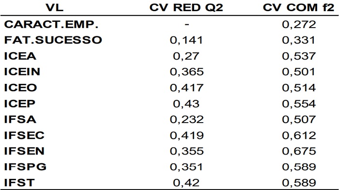 Ringle, Silva e Bido (2014) explicaram que é o quanto o modelo se aproxima do que se espera dela e (Q²) ou índice de Stone-Geisser e Tamanho do efeito (f²) ou Indicador de Cohen (1988) é o quanto cada constructo é “útil” para o modelo ajustado. A Tabela 4 evidencia que os valores de Q²e de f² estão apropriados; os quais conforme esclareceram Ringle, Silva e Bido (2014), indicam que o modelo está adequado, quando Q² está acima de zero e f² (0,02 são considerados pequenos, 0,15 são médios e 0,35 são grandes) e que os constructos são relevantes para o modelo ajustado.