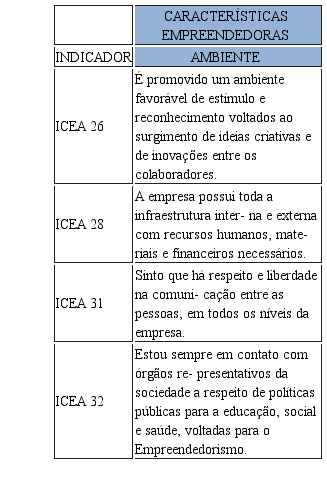 No Quadro 2 estão evidenciados os indicadores e as Características Empreendedoras do Ambiente, destacadas pela MEE: