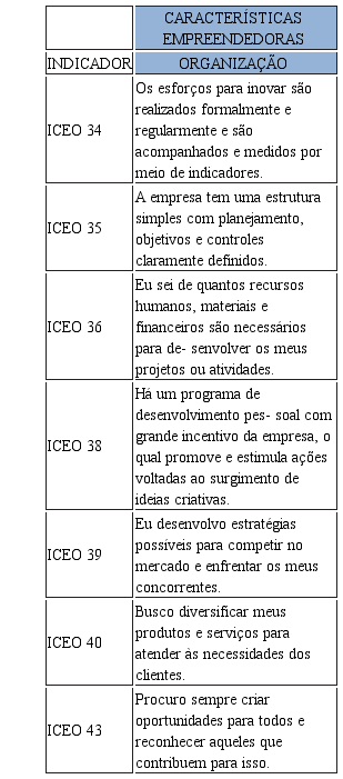 c) Indicadores reflexivos das Características Empreendedoras da Organização - ICEO 33, ICEO 34, ICEO 35, ICEO 36, ICEO 37, ICEO 38. ICEO 39, ICEO 40, ICEO 41, ICEO 42 e ICEO 43;