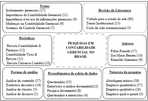 Algumas pesquisas nacionais também demonstraram interesse em discutir aspectos temáticos, epistemológicos e metodológicos da Contabilidade Gerencial. Nascimento, Junqueira e Martins (2010) identificaram e analisaram características epistemológicas da produção acadêmica da pesquisa em Contabilidade Gerencial no Brasil. Lourenço e Sauerbronn (2017) foram mais específicos, a partir de uma análise interpretativista, apresentaram uma reflexão sobre o uso da Teoria da Agência nas pesquisas em Contabilidade Gerencial no Brasil, com considerações de suas premissas e limitações, além de outras formulações teóricas para o conceito de agência. Já Faria e Leal (2017) se concentraram nos conteúdos da Contabilidade Gerencial, ao examinar o nível de aderência dos conteúdos de Contabilidade Gerencial nas ementas das disciplinas dos cursos de Ciências Contábeis das instituições de ensino superior de Minas Gerais, à luz do Currículo Mundial e da proposta nacional apresentada pelo Conselho Federal de Contabilidade.