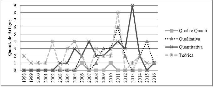 Os resultados da Figura 2 chamam atenção pelo fato da quantidade de pesquisas empíricas de natureza quantitativa (38) ser semelhante a de estudos teóricos (37). Contudo, esse tipo de estudos predominava no início do período analisado, cujo teor era sobre reflexões relativas a existência da Contabilidade Gerencial, o impacto do BSC na Contabilidade Gerencial, funções e importância da Contabilidade Gerencial. Esse tipo de abordagem já não é mais tão incentivado no meio acadêmico para fins de publicação (FREZATTI et al., 2015). No entanto, surpreende que há oito artigos teóricos no ano de 2011, com conteúdos distintos, como, por exemplo, orientação temporal dos gestores (AGUIAR, 2011), paradoxo na utilização de artefatos gerenciais (COSTA; CRUZ; ESPEJO, 2011), discussão das teorias da Contabilidade Gerencial sob o paradigma funcionalista (PORPORATO, 2011). Esses três artigos, citados a título de ilustração, foram publicados na Revista Universo Contábil.