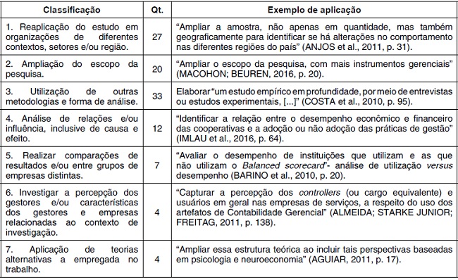 Foram listadas 107 propostas de pesquisas futuras em 55 artigos (54%), enquanto que Marques, Camacho e Alcantara (2015) constataram que 42% dos estudos publicados em periódicos brasileiros traziam propostas de continuação. Assim como no estudo de Araújo et al. (2016), as sugestões apresentadas foram associadas semanticamente entre si, o que propiciou o enquadramento delas em sete grupos, de acordo com o propósito, algumas vezes implícito e inferido pela interpretação das recomendações. No Quadro 1 apresentam-se algumas recomendações de estudos futuros encontradas nos artigos analisados.