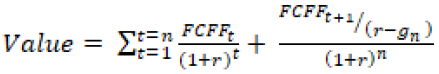 According to this methodology, the company’s value is determined by the sum of present and future benefits’ streams, discounted at a rate that reflects the opportunity cost and the risks associated with the investment (CUNHA; MARTINS; ASSAF NETO, 2014). Therefore, the method consists in bringing the sum of the cash flows to the present value over a period in which it can be estimated with reasonable certainty, discounted at a rate that reflects the risk. In addition, the company’s present value of the residual value or perpetuity is added, which are the flows not covered by the projection, discounted by the difference between the rate of risk and the rate that these flows are expected to grow. In short, the model can be defined as the equation (1):