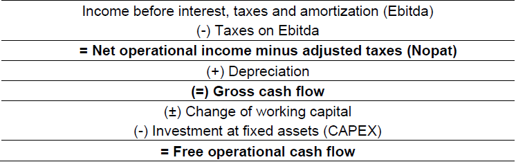 Also, operational cash flow can be estimated from several perspectives: the company, the shareholders and dividends, thus allowing different information, in view of the objectives of its various users (SANTOS; CUNHA, 2015). For the purpose of this paper, we considered the company's cash flow approach, which is the most common among companies’ appraisal reports. However, it should be noted that in situations of consistency of the assumptions used, the results obtained by different models are the same (GALDI; TEIXEIRA; LOPES, 2008). The calculation of the company's cash flow can be explained in Chart 1.