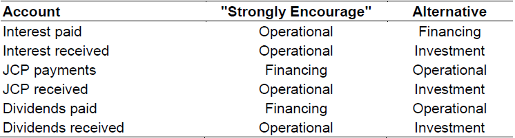 This classification, however, does not have a consensus for interest, dividend and interest on shareholders' equity. In the CFS, the Brazilian Committee still encourages some classifications, but provides the managers with the options of the accounting choice they deem most appropriate. Interest paid and received, dividends and interest on shareholders 'equity received can be classified as both operational cash flow and financing (interest paid) and investment (interest, dividends and interest on shareholders' equity received). On the other hand, dividends and interest on paid capital can be both financing and operational cash flows.