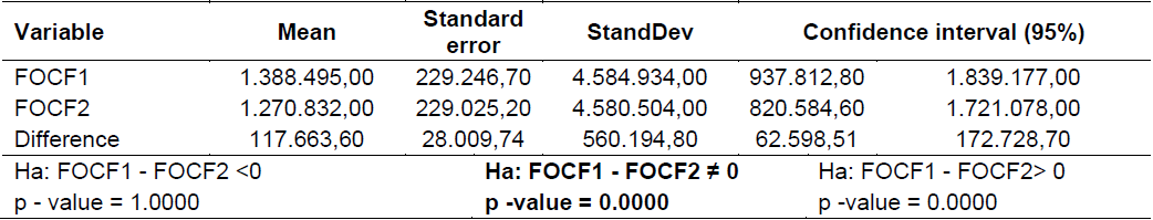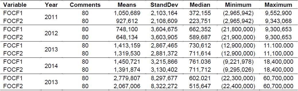 It should be pointed out that, for analysis, two company's cash flows were calculated: the first one (FOCF1) does not take into account the dividends as an operational account, and therefore does not compute the working capital calculation. Subsequently, (FOCF2) was calculated, in which dividends, both received and paid, were considered as operating. Thus, they were added to the Working Capital (WC) calculation. As the WC implies in the variation between operating assets, deducted from operating liabilities, the dividend’s balances accounts that were included in the Balance Sheet were added to the WC.