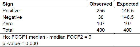 The p-value of 0.000 rejects the null hypothesis that the medians of the variables did not present statistical difference. This corroborates the mean test performed previously and confirms the prediction made by the hypothesis: the presence of dividends in working capital calculation influences the company’s free cash flow measurement.
