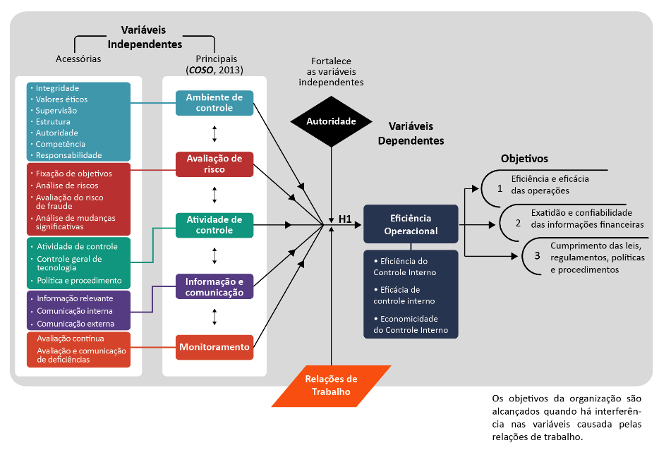 O efetivo funcionamento das variáveis independentes (construtos) proporciona a consolidação da variável dependente (eficiência operacional) (AMUDO; INANGA, 2009). Assim, a eficiência operacional do Controle Interno (variável dependente) é atingida mediante a presença de seus componentes (variáveis independentes), que são predefinidas em relação a cada uma das categorias de objetivos da organização (SILVA; GOMES; ARAÚJO, 2014).