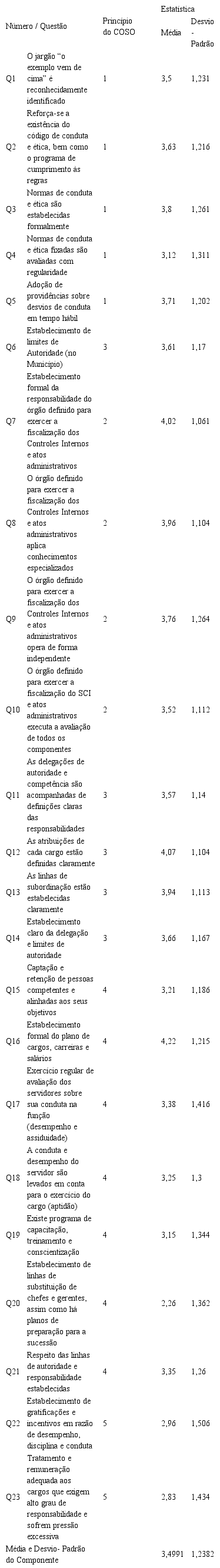 No que se refere ao ambiente de controle, verificou-se que especial atenção deve ser dada à gestão de pessoas, especialmente na preservação e capacitação funcional e na preparação de gerentes. Os resultados descritivos do componente Ambiente de Controle, que correspondem aos princípios 1 a 5, e pontos de foco 1 a 20 do modelo COSO Framework (COSO, 2013), em face das questões Q1 a Q23, integrantes do questionário aplicado, estão listados na Tabela 2.