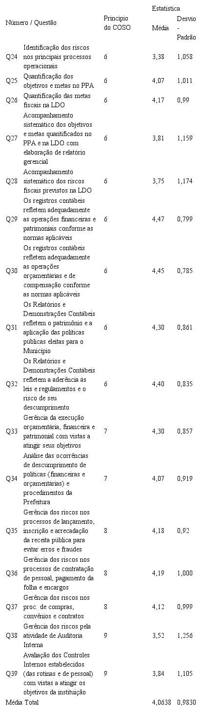 A Tabela 3 apresenta os resultados, descritivos do componente Avaliação de Risco, em razão das questões Q24 a Q39, integrantes do questionário aplicado, que correspondem aos princípios 6 a 9, e pontos de foco 21 a 37 do modelo COSO Framework (COSO 2013).
