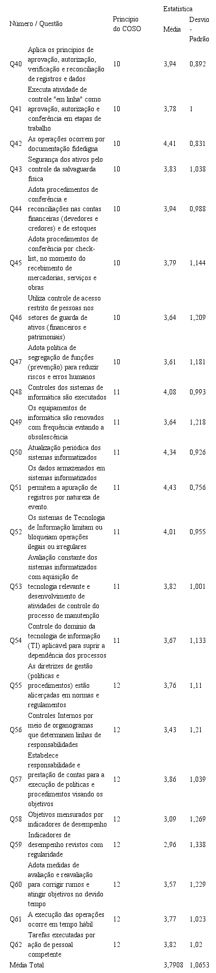 A Tabela 4 mostra os resultados descritivos do componente Atividade de Controle, em face das questões Q40 a Q62 do questionário aplicado, que correspondem aos princípios 10 a 12, e pontos de foco 38 a 53 do modelo COSO Framework 2013(COSO, 2013).
