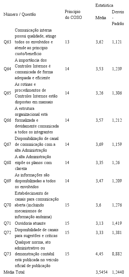 A Tabela 5 traz os resultados descritivos do componente Informação e Comunicação, em face das questões Q63 a Q73, do questionário aplicado, que correspondem aos princípios 13 a 15, e pontos de foco 54 a 67 do modelo COSO Framework (COSO, 2013).