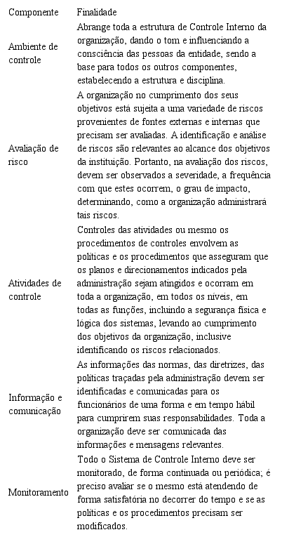 Dessa forma, o Controle Interno deve ser implementado em toda a organização, como um processo constituído por cinco componentes relacionados entre si: o ambiente de controle, a avaliação de risco, os procedimentos de controle, a informação e comunicação, e o monitoramento (MAIA et al., 2005). Deve se vincular aos princípios e pontos de foco do modelo COSO Framewok, incorporado às normas e políticas internas para aprimorar o controle de suas atividades e orientar a realização dos objetivos predeterminados (COSO, 2013; TEIXEIRA, 2014).
