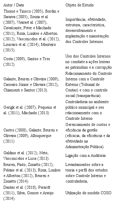Os estudos apontam diversidade de interesses do tema Controle Interno na Administração Pública, sendo um campo de saber não sistematizado quanto à linguagem das evidências empíricas (SILVA; GOMES; ARAUJO, 2014). Perpassa por abordagens com objetivos desde a análise de aderência dos órgãos ou relatórios de Controle Interno até a propositura de modelos que subsidiem a busca por mais transparência na gestão pública (LOUREIRO et al., 2014).Os trabalhos, quase que maciçamente se encontram no campo da atividade privada, pouco se conhecendo quanto a sua aplicação no ramo da Administração Pública, ressaltando-se que, apesar da relevância da temática Controle Interno no âmbito público, pouco se conhece a respeito das contribuições científicas desenvolvidas nessa questão (BEUREN; ZONATTO 2014).