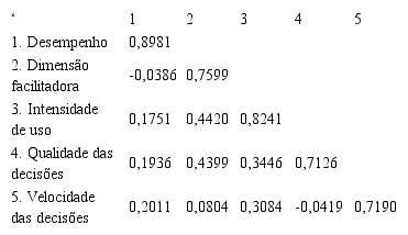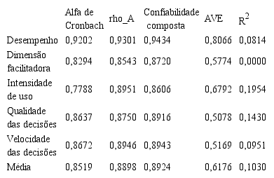 A validade e confiabilidade do construto também foram avaliadas com base na análise da variância extraída (AVE). A Tabela 1 mostra que os construtos apresentam convergência adequada uma vez que seus coeficientes estão acima de 0,50 (FORNELL; LARCKER, 1981; HAIR JR. et al., 2009).