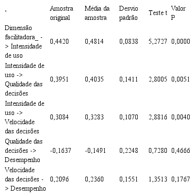 Para avaliar os coeficientes de estabilidade, executamos o bootstrapping (CHIN; NEWSTED, 1999, p. 328) seguindo a especificação sugerida por Hair et al. (2011, p. 145). O bootstrapping foi especificado com 5.000 reamostragens (4.999 graus de liberdade e teste bicaudal) e um intervalo de confiança de 95%. Na Tabela 4 pode-se observar que algumas estimativas de modelo são significativas considerando o teste t ao nível de 5% que são superiores a 1,96 (valor p < 0,05). Na Tabela 4, apresentam-se os coeficientes de caminho do bootstrappinge as relações entre as variáveis latentes significantes, que serão discutidas mais a frente.