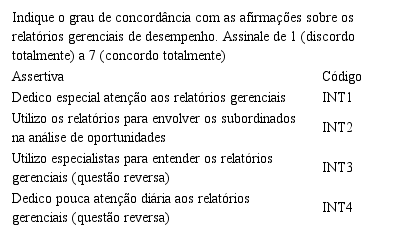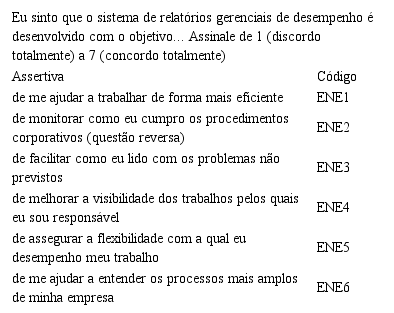 Como os respondentes dessa pesquisa são gerentes de lojas que têm pouca autonomia para definirem os orçamentos, optou-se, após as duas entrevistas realizadas, por utilizar o termo relatórios gerenciais de desempenho em lugar de usar o termo SCG, basicamente, por se considerar que o público-alvo são gestores de nível operacional. A dimensão facilitadora do uso dos relatórios gerenciais de desempenho foi operacionalizada com base no Quadro 1.