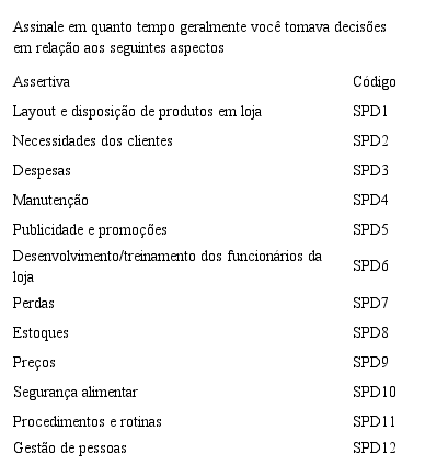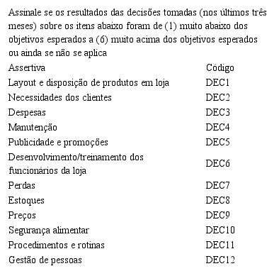 Considerou-se um horizonte de três meses, pois as atividades gerenciais do varejo são bastante dinâmicas e, também, uma alternativa do tipo “não se aplica” foi colocada, já que é possível que alguma decisão não tenha sido tomada nesse horizonte. Assim, o construto qualidade das decisões foi formulada com os itens apresentados no Quadro 3.