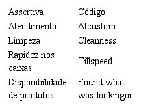 Também foi testada a normalidade dos dados com base no teste de Kolmogorov-Smirnov. Observou-se que somente as variáveis Limpeza (Cleanness) e Rapidez nos caixas (Tillspeed) apresentaram normalidade nos dados. Adicionalmente, realizamos novos testes seguindo as recomendações de Kline (2011, p. 63) que sugere trabalhar com pontos de cortes de 3,0 para valores absolutos de assimetria e 10,0 para valores absolutos de curtose. Em nossa análise, notamos que a amostra possui os valores máximos de 2,599 e 8,704 de assimetria e curtose, respectivamente. Portanto, há evidência de que os dados são distribuídos normalmente.