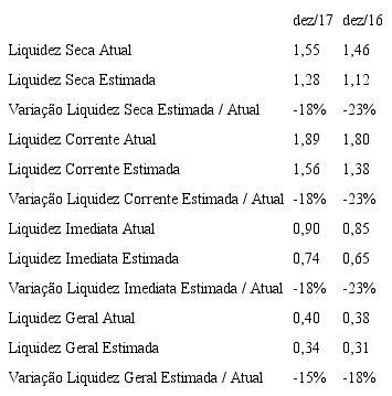 O Quadro 2 indica que a Petrobras apresentou em 2017 uma liquidez seca de 1,55 e 1,46 em 2016, liquidez corrente de 1,89 em 2017 e 1,80 em 2016, e liquidez imediata de aproximadamente 0,90 em 2017 e 0,85 em 2016. Tomando como base os valores indicados, os índices financeiros mudariam da seguinte forma: liquidez seca seria de 1,28em 2017 e 1,12 em 2016, liquidez corrente 1,56em 2017 e 1,38em 2016, e liquidez imediata de 0,74em 2017 e 0,65 em 2016.