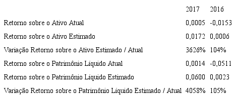 Em 2016, a empresa auferiu prejuízo de R$ (13.045) milhões e ativo total médio de R$ 852.540 milhões. Com isso, a empresa apresenta um retorno sobre o ativo no valor de 0,0005 em 2017 e (0,0153) em 2016. O retorno sobre o ativo de 2017 e 2016, conforme Quadro 3, impactado principalmente pela mudança do resultado, reduziu para aproximadamente 0,0172 e 0,0006, respectivamente, apresentando uma variação de 3626% em 2017 e de 104% em 2016.