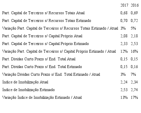 Se o valor indicado nas notas explicativas como o montante a pagar que a empresa possui referente a leasing operacional fosse registrado no ativo e passivo (com a segregação do curto prazo e longo prazo), esses indicadores assumiriam os seguintes valores: participação de capital de terceiros sobre os recursos totais de 0,70 em 2017 e 0,72 em 2016, participação de capital de terceiros sobre o capital próprio de 2,33em 2017 e 2,53 em 2016, participação das dívidas de curto prazo em relação ao endividamento total de 0,15 em 2017 e 0,16 em 2016, e uma imobilização do patrimônio líquido de 2,53 em 2017 e 2,74 em 2016.