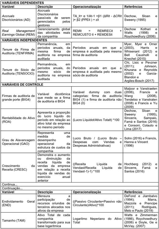 As variáveis de interesse correspondem à tenure da firma de auditoria e à tenure do sócio de auditoria. As variáveis de controle foram selecionadas de acordo com a literatura que retratam aspectos econômico-financeiros estão relacionados à manipulação exercida por gestores. Especialmente, a variável BIG4 foi escolhida porque a literatura relata diferença do nível de gerenciamento de resultados quando a empresa é auditada por uma firma de auditoria que pertence ao grupo de firmas de auditoria BIG4 em comparação às demais firmas de auditoria.