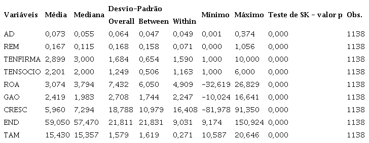 Os resultados da estatística descritiva das variáveis quantitativas utilizadas no estudo estão descritos na Tabela 1.