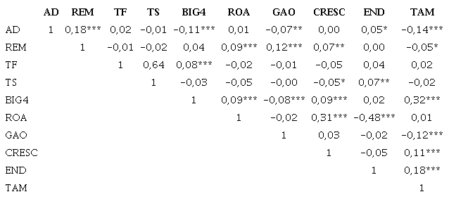 Em uma análise na Tabela 2, percebe-se que os accruals discricionários e o real earnings management estão positivamente e significativamente correlacionados. Este resultado pode indicar que, à medida que os gestores recorrem ao gerenciamento de resultados por accruals discricionários, também adotam práticas de gerenciamento de resultados por atividades operacionais reais. Quanto aos testes de correlação entre a tenure da firma de auditoria e tenure do sócio de auditoria com os accruals discricionários, os coeficientes não foram significativos, sugerindo que a tenure da firma e a tenure do sócio de auditoria não estão relacionadas com o nível de gerenciamento de resultados por accruals.