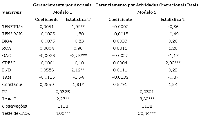 Após o teste de correlação de Pearson, os dados foram submetidos à análise multivariada com o propósito de verificar o efeito da tenure da firma e sócio de auditoria no gerenciamento de resultados por accruals e atividades operacionais reais, como reportado na Tabela 3.