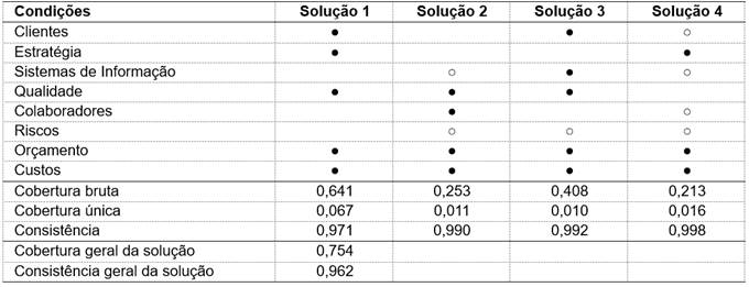 Para as startups atingirem um alto desempenho da inovação, percebe-se que algumas práticas de Controle Gerencial são necessárias (qualidade e custos) e outras são quase sempre necessárias (clientes, estratégia e orçamento). Para além das condições que potencialmente são quase sempre ou sempre necessárias, faz-se pertinente saber se por si só ou combinadas elas são suficientes para atingir o alto desempenho (Ragin, 2008). Deste modo, aplica-se a construção de uma tabela verdade de 2^k linhas (k = n elementos configuracionais) (Ragin, 2008), no caso, a quantidade de práticas de Controle Gerencial que antecedem o desempenho da inovação. Seguindo recomendações de Ragin (2008), utiliza-se de um limite de consistência 0,80, para refinar a tabela verdade e evidenciar as soluções que promovem alto performance do output. Na Tabela 3, demonstra-se as quatro soluções obtidas com base nos parâmetros instrumentalizados.