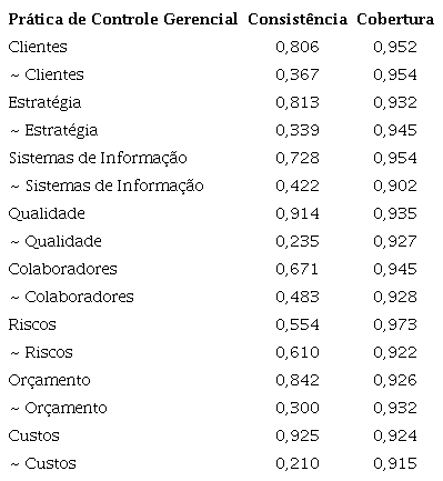 Com os dados calibrados, faz-se primeiramente a análise das condições necessárias para o sucesso de determinado resultado (Ragin, 2008). A presença (ou ausência de uma condição) é necessária quando sua consistência é maior ou igual a 0,90, e quase sempre necessária quando a consistência for igual ou superior a 0,80 (Ragin, 2000). A Tabela 2 apresenta maiores informações sobre essa análise de necessidade das práticas de Controle Gerencial.