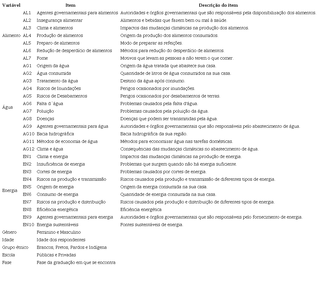 A Tabela 1 apresenta as variáveis e os respectivos itens que foram questionados em relação aos elementos FEW nexus.