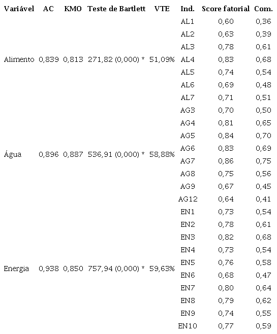 Verificou-se a partir da Tabela 2 que o constructo alimento apresenta alta confiabilidade de dados, pois está acima do limiar de 0,70, conforme recomendado por Fávero (2017). O mesmo ocorreu para os constructos água e energia. Por meio do critério KMO (Kaiser-Meyer-Olkin) e do teste de Bartlett verificou-se a adequação dos itens referentes a cada constructo.