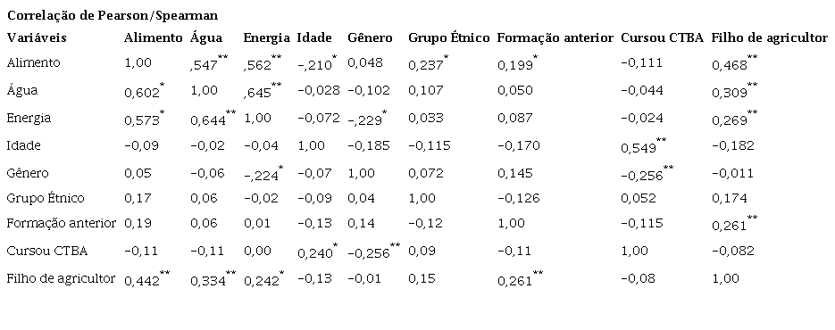 Dentre as características dos discentes analisadas a variável filho de agricultor se destacou por apresentar correção positiva com as variáveis alimento, água e energia, tanto no teste de Pearson como no teste de Spearman. Pode-se inferir que o fato destes indivíduos terem maior proximidade com o plantio de alimentos, criação de animais e outras atividades rurais, apresentam relação com o modo de perceber o FEW nexus. No estudo de Dargin et al., (2020), a experiência anterior em desastres naturais se mostrou como um dos indicadores socioeconômicos mais forte na preparação das famílias para o enfrentamento de desastres, o que as torna menos vulneráveis aos riscos de interrupções dos sistemas alimentares, energéticos e hídricos. Acredita-se o acúmulo de experiências, aprendizados anteriores, questões culturais podem influenciar no modo de perceber os fenômenos (Brandalise et al., 2009; Santos, Freitas & Dias Filho, 2020) e, consequentemente, o FEW nexus.