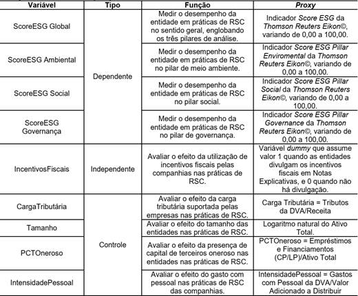 Tendo em vista que o objetivo da pesquisa é investigar o efeito dos incentivos fiscais sobre a RSC, adotou-se como variável independente a presença de incentivos fiscais (IncentivosFiscais) através das divulgações em Notas Explicativas às Demonstrações Financeiras (NE) de informações sobre a utilização ou não desses incentivos, uma vez que não há evidenciação sobre os valores efetivamente beneficiados com as reduções do montante devido nas obrigações tributárias.