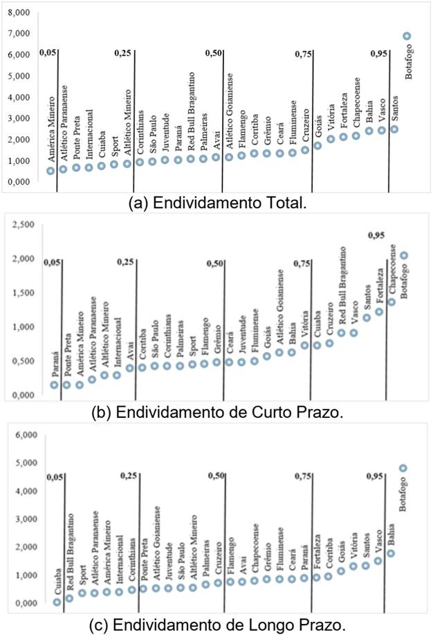 Ademais, é possível observar a heterogeneidade do endividamento das agremiações de futebol na Tabela 3. Enquanto o clube centrado no menor percentil de análise (5%) apresenta índice de endividamento total de 53% do seu patrimônio, os 5% mais endividados (percentil 95%) tem aproximadamente 450% de dívidas. Nas divisões de curto e longo prazo, o mesmo cenário é observado. Ambas as situações apresentam no menor percentil um patamar de 10% de dívidas de curto e longo prazo e, no maior 162% e 232%, respectivamente. A Figura 1(a) indica os clubes que compõe cada quantil para o endividamento total, enquanto a Figura 1(b) e Figura 1(c) apontam o mesmo para o endividamento de curto e longo prazo, respectivamente.