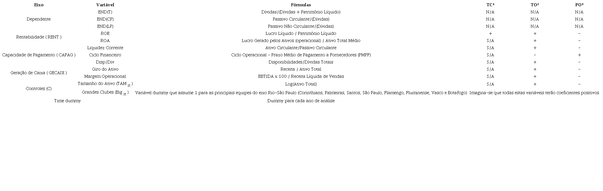 Visto isso, o presente estudo abordará três variáveis dependentes, a saber: a proporção das dívidas totais com capital de terceiros(END(T)it ), a qual será expressa pelo somatório do passivo circulante e passivo não circulante dos clubes dividido pelo ativo total; a proporção das dívidas com terceiros de curto prazo (END(CP)it ), expresso pelo quociente do passivo circulante e as dívidas totais, expressa pelo o somatório de passivo circulante e passivo não circulante dos clubes; e, a proporção das dívidas de longo prazo (ENDit ), mensurada pela divisão entre o passivo não circulante e as dívidas totais (Tabela 1).