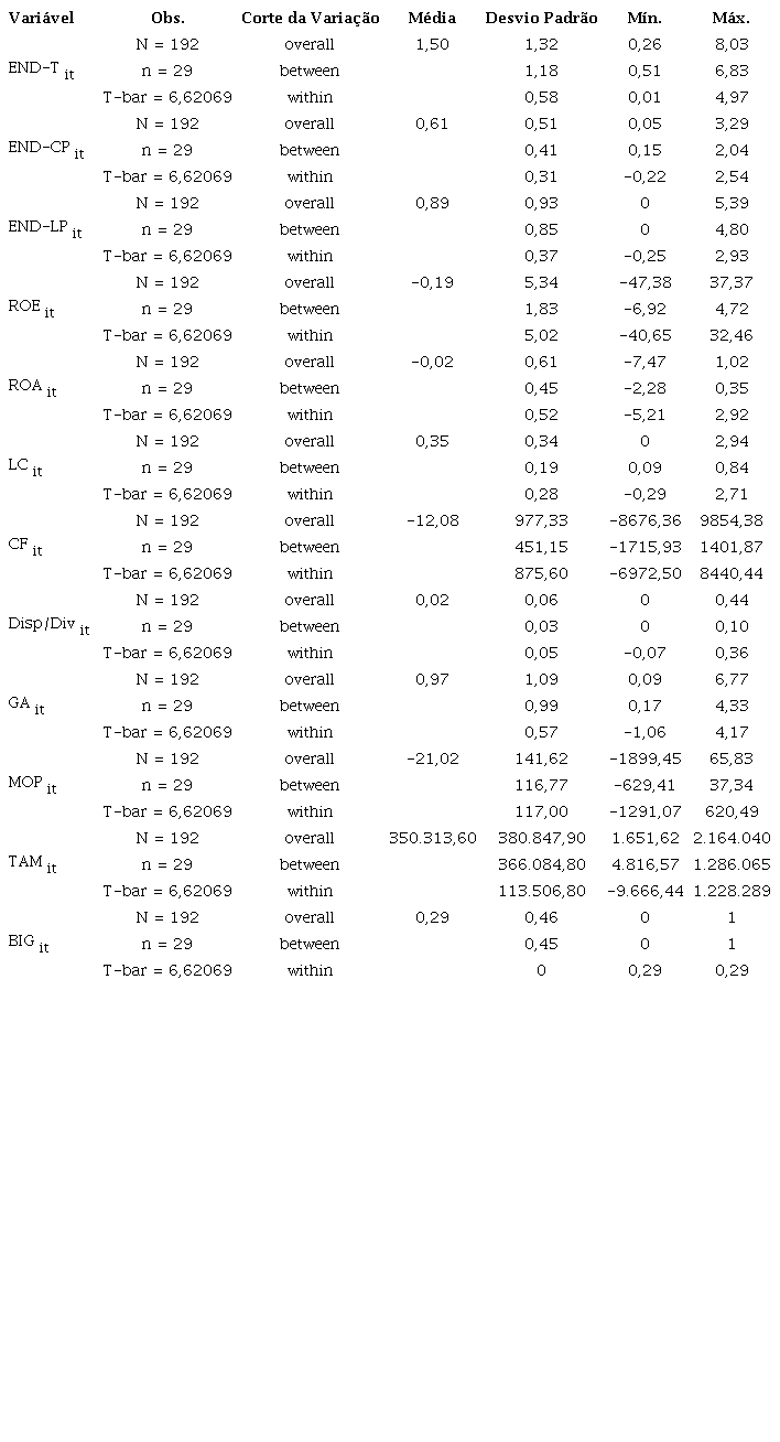 As próximas subseções descrevem as variáveis utilizadas e as fontes de dados básicas para a formação da amostra analisada. Ademais, a robustez para um cenário de pequenas amostras e a premissa de uma matriz de covariância analítica das diversas formas de heterogeneidade faz o método ser o mais indicado para os casos de análises de estruturas de capitais.