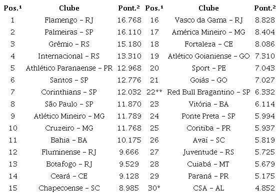Desde a promulgação da Lei nº 10.672 de 15 de maio de 2003 os clubes de futebol são obrigados a divulgar suas informações financeiras como meio de garantir a transparência fiscal e administrativa. Sendo assim, a base de dados será composta por informações das demonstrações contábeis dos primeiros 29 clubes do Ranking Nacional de Clubes de 2021 disponibilizado pela CBF, conforme Tabela 2.