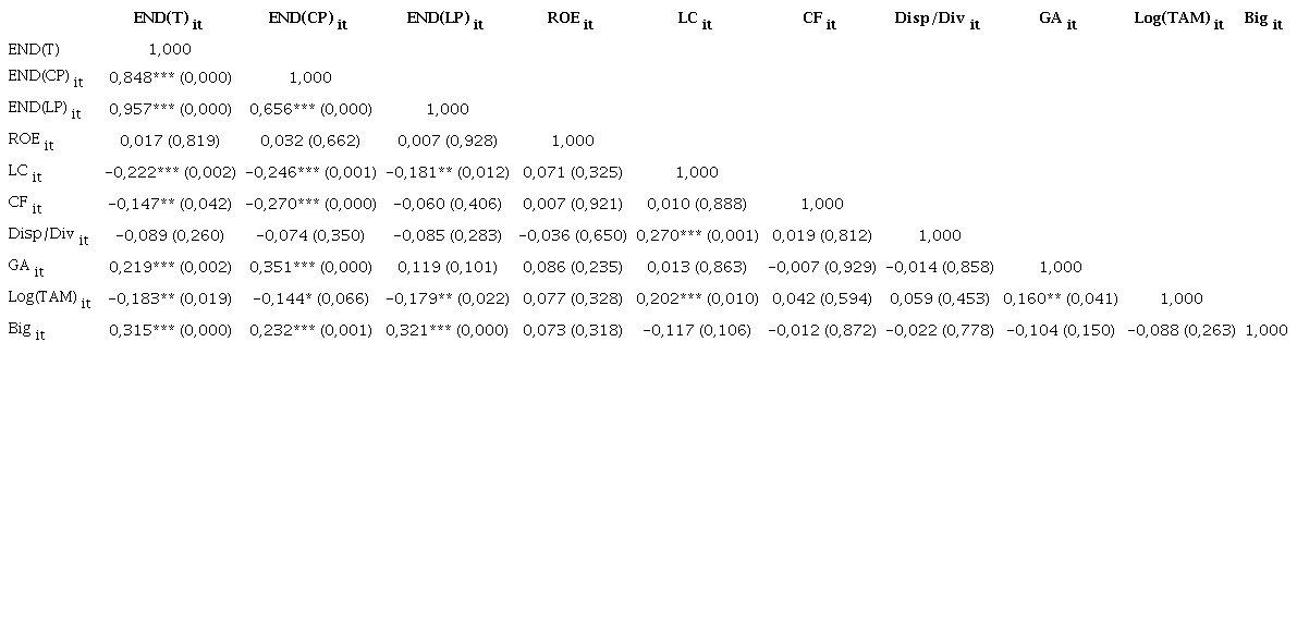 O modelo inicialmente proposto apresentou problemas de multicolinearidade e de estacionariedade, sendo necessários alguns ajustes. Assim, foram excluídas as variáveis ROA e Margem Operacional, enquanto a razão entre as disponibilidades e as dívidas e o logaritmo do tamanho foram diferenciados em primeira ordem. Estas condições são comuns na literatura de estrutura de capital brasileira, visto a heterogeneidade das entidades locais (Nakamura, Martin, Forte, Carvalho Filho, & Amaral, 2007; Medeiros & Daher, 2008).