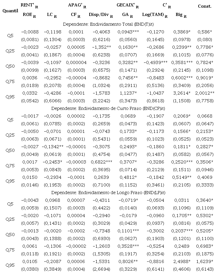 Por fim, tomando por base o conjunto de observações foram estimados os coeficientes para diversos quantis (0,05; 0,25; 0,50; 0,75; 0,95) das distribuições de endividamento total 𝐸𝑁𝐷(𝑇)𝑖𝑡, de curto prazo 𝐸𝑁𝐷(𝐶𝑃)𝑖𝑡 e longo prazo 𝐸𝑁𝐷(L𝑃)𝑖𝑡 , como apresentado na Tabela 5. Os valores de erro padrão são mostrados em parênteses. Apenas alguns coeficientes foram estatisticamente significativos, em particular, aqueles que se referem a geração de caixa (especificamente, giro do ativo) e o controle de grandes clubes para todos os níveis de endividamento.