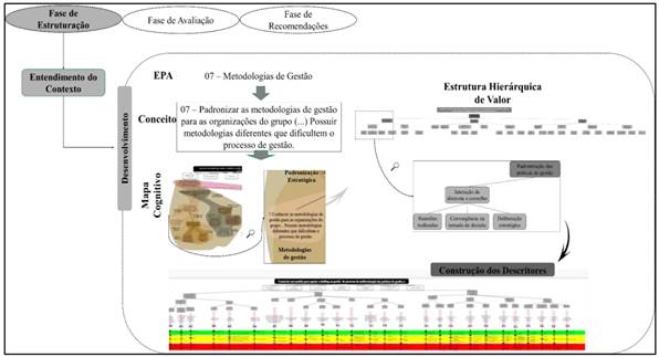 A primeira fase de desenvolvimento do modelo (Estruturação) configura-se como uma etapa qualitativa, que compreende os elementos específicos do ambiente decisional. Essa fase demandou intensas interações com o entrevistado, pelo fato de não estar claro qual deveria ser o primeiro passo para o processo de gestão portuária ser colocado em prática. Em um primeiro momento, era construir um modelo de autoavaliação da Holding para os Portos Delegados de Santa Catarina. No entanto, após a participação de um especialista da metodologia utilizada, percebeu-se que, antes de avaliar o desempenho da Holding no processo de gestão, era preciso verificar o comportamento dos Portos em relação à conformidade das práticas adotadas.