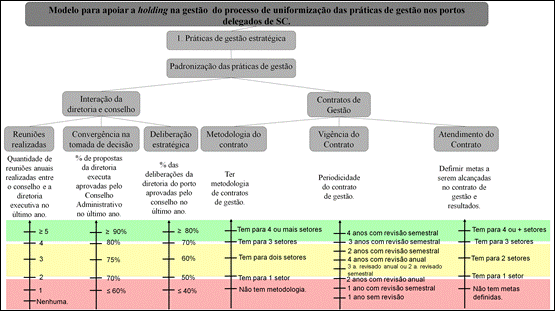 Em Santa Catarina, em 2005, o governo estadual criou uma Holding concedendo-lhe o direito de exploração dos portos públicos, o controle acionário e a responsabilidade de gestão desses portos delegados. Contudo, não há uma uniformização das práticas de gestão adotadas pela Holding, o que dificulta o processo de gestão de seus Portos Delegados. Em vista disso, há a necessidade de se ter um instrumento que evidencie, de forma transparente, quais práticas de gestão estratégica portuárias são priorizadas e incentivadas por uma Holding. Para tal, quais aspectos devem integrar um modelo de avaliação de desempenho, observando os objetivos estabelecidos pela Holding e as particularidades de seus Portos Delegados, para uniformizar as práticas de gestão portuárias? Para responder a essa questão, o estudo tem por objetivo construir um modelo construtivista de avaliação de desempenho para apoiar a Holding no processo de uniformização das práticas de gestão estratégica das atividades portuárias.