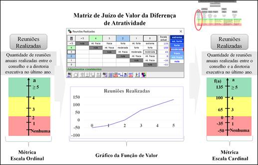 A utilização dos mapas cognitivos, por exemplo, evidencia as relações de causa e efeito entre os aspectos que estão sendo analisados, evitando assim que aspectos não explicitados ou omitidos não sejam considerados (Eden, 2003; Ferreira et al., 2010). A Estrutura Hierárquica de Valor evidencia os objetivos pelos quais o statu quo ou as alternativas serão avaliados (Keeney, 1992). O uso das funções de valor (escalas cardinais) evidencia a atratividade entre os níveis da escala ordinal segundo a percepção do gestor/decisor, permitindo a mensuração local do desempenho do statu quo ou das alternativas nesse objetivo (Ferreira et al., 2010). Nesse sentido, a metodologia MCDA-C apoia a tomada de decisão em determinados contextos, seguindo a perspectiva de seus tomadores de decisão (Espinosa & Salinas, 2013).