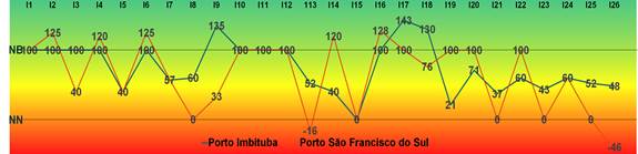 Já o perfil de desempenho do Porto de Imbituba mostra que, para os indicadores construídos pelo decisor, o Porto não se encontra com desempenho em nível comprometedor. Os indicadores ‘Reinvestimento de Receitas (I17)’ e ‘Indicadores de Acesso (I18)’, os quais o Porto impacta em nível de excelência, demonstram que existe uma preocupação em melhorar continuamente suas atividades. Além disso, sua preocupação com o desenvolvimento social e o econômico conduz à integração do planejamento do desenvolvimento portuário com os instrumentos de planejamento estratégico, evidenciado pela utilização de quatro dos seis instrumentos de planejamento (Tipos de Instrumentos - I13). Dentre os indicadores em que o Porto apresenta desempenho em nível de excelência, podem ser extraídas práticas que figuram como importantes para a uniformização. Por não apresentar desempenho em nível comprometedor nos critérios estabelecidos, o foco das ações para melhoria do desempenho deve voltar-se para aqueles indicadores que, embora estejam em nível competitivo, têm potencial de melhoria. O intuito é trabalhar com o Porto para melhorar aqueles indicadores com desempenho mais baixo e apresentam maior contribuição para a avaliação global do modelo, como, por exemplo, ‘Vigência dos Instrumentos (I15)’ e ‘Investimentos nos Acessos (I19)’.